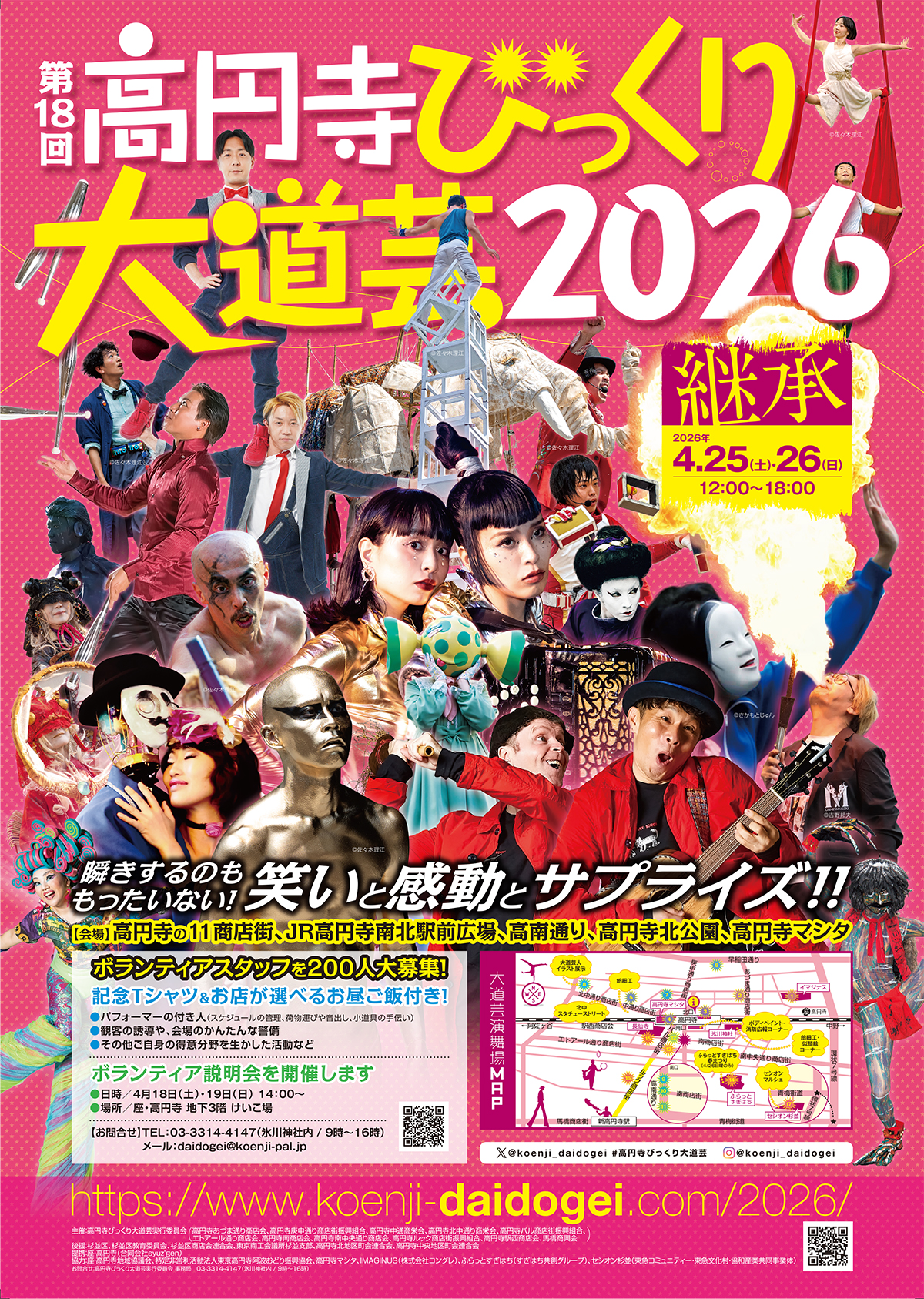 - お問い合わせ:高円寺びっくり大道芸実行委員会事務局:03-3314-4147(9~16時)