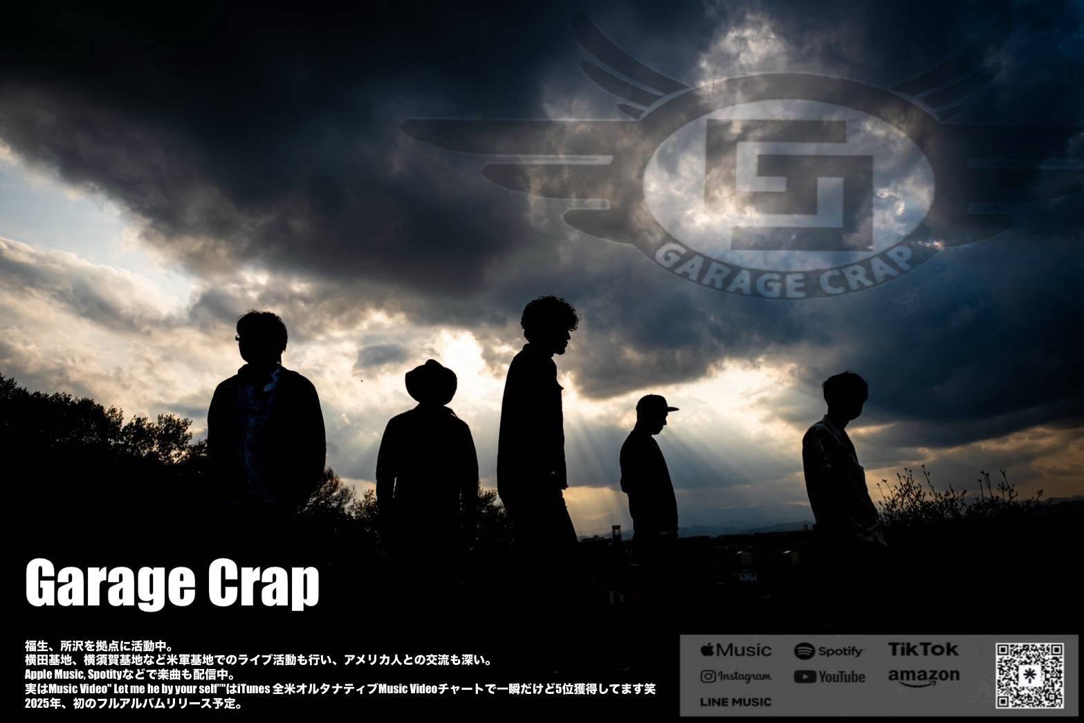2012年に結成。 都西多摩エリア、埼玉県入間市、狭山市を中心に活動する5ピースRock Band。 ボーカルJayが務める米軍基地のある街、東京都福生市を拠点に活動。ライブではアメリカ人と日本人が入り混ざり盛り上がる。 レコーディング、ライブなど、Garage Crapとして14年目を迎える今年も周りの人に恵まれ、活動を精力的に行なっている。 音楽をライフワークとして、ライブでは演奏側だけでなく、その空間にいる全ての人たちの思いが重なり合って、みんなが主役になれるMomentだと信じ、それを体現出来るよう、音楽のみに捉われず活動している。iTunes, Apple Music, Spotify などダウンロード、ストリーミングサイトにて楽曲配信中。