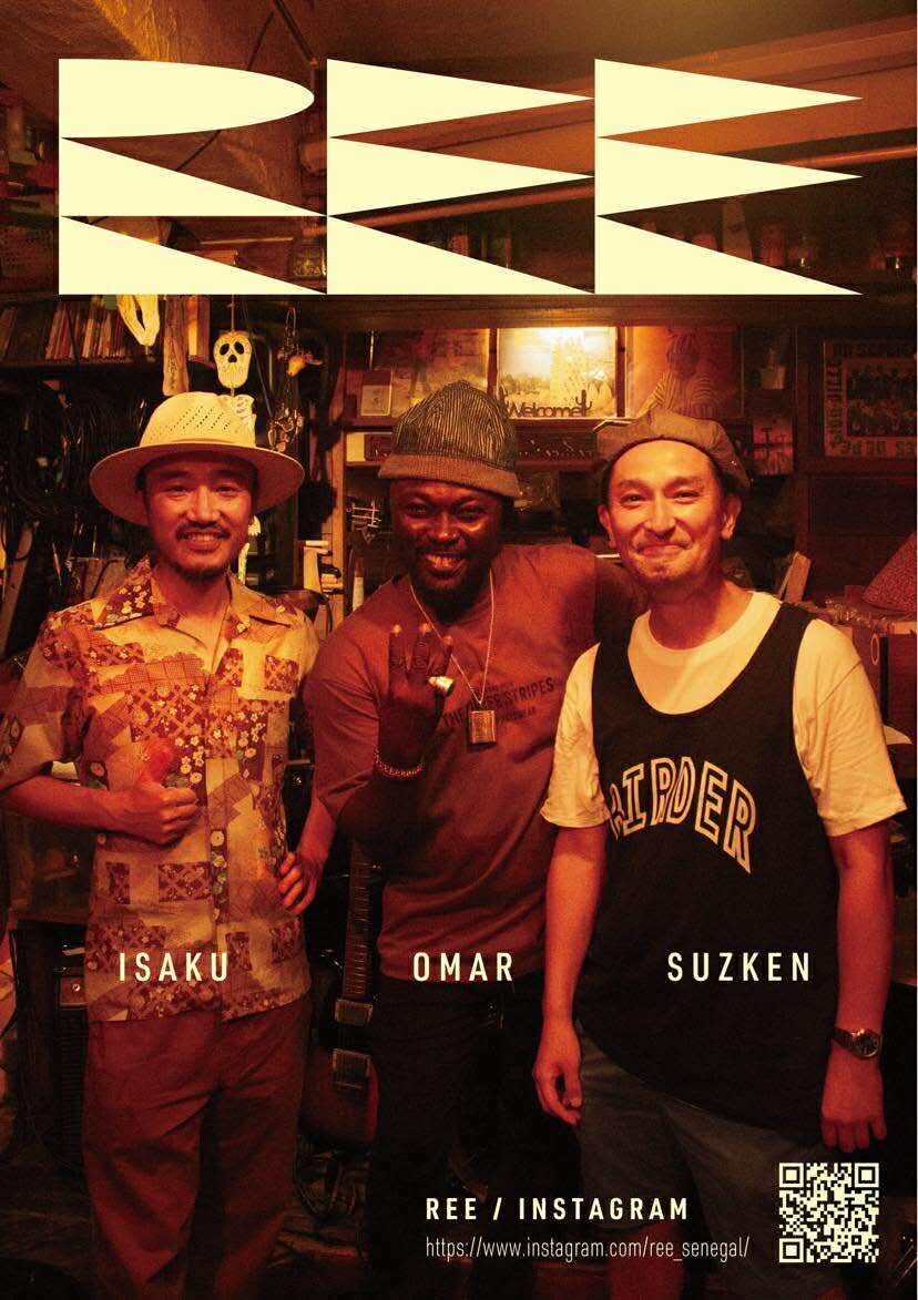 "REE"とはセネガルの言葉ウォロフ語で"SMILE"の意味。2025年より活動開始。力強い歌、ジェンベ、グルーヴィなベース、繊細でダイナミックなギター、そして美しいコーラスワーク。ソウル・ファンク、アフロビートを基調に、情熱的で魂を揺さぶる音楽を奏でる。ライブでは唯一無二のパフォーマンスと心に響くハーモニーを体感できます。 "REE" Omar Gaindefall : vocal , djembe、Isaku Suzuki : guitar , chorus、SuzKen : bass , chorus。