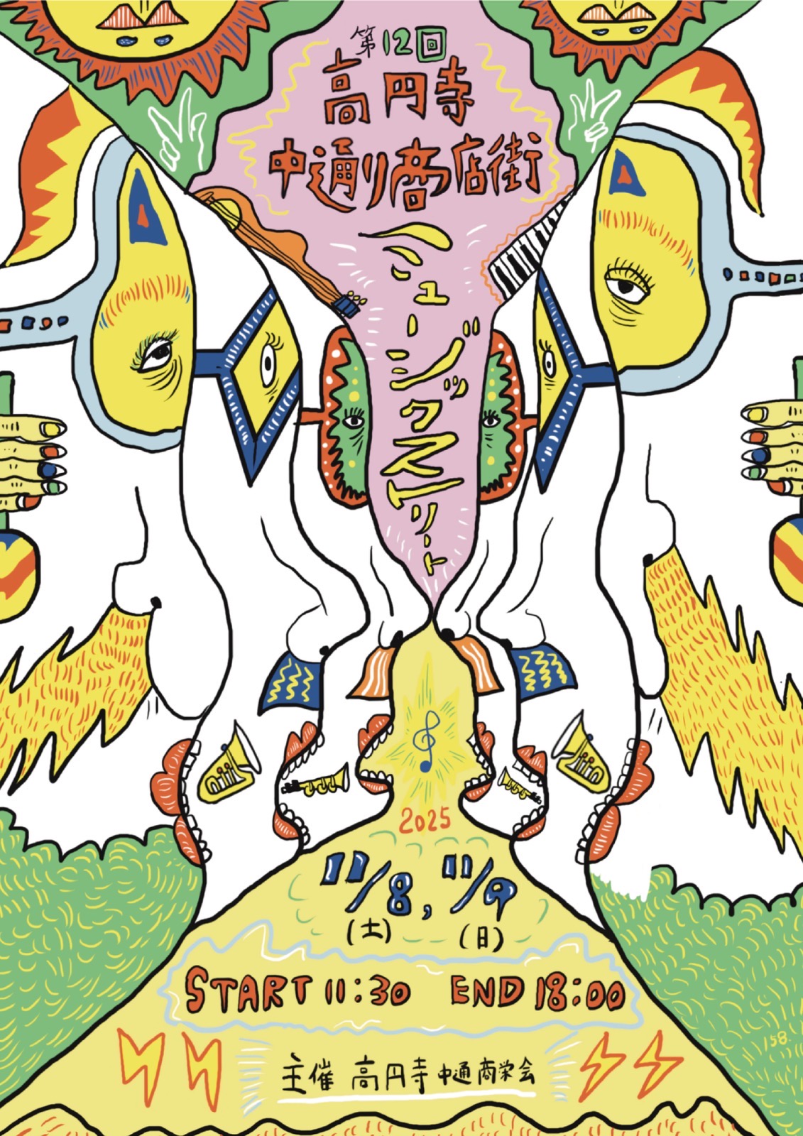 第12回の開催となる「高円寺中通り商店街 ミュージックストリート」を11月8日(土)〜9日(日)に開催します! 出演アーティストは全81組! 中通り商店街内の9つの会場で、様々なジャンルのミュージシャンによるライブパフォーマンスをお楽しみください!