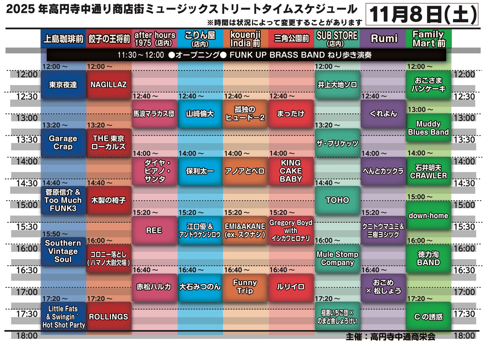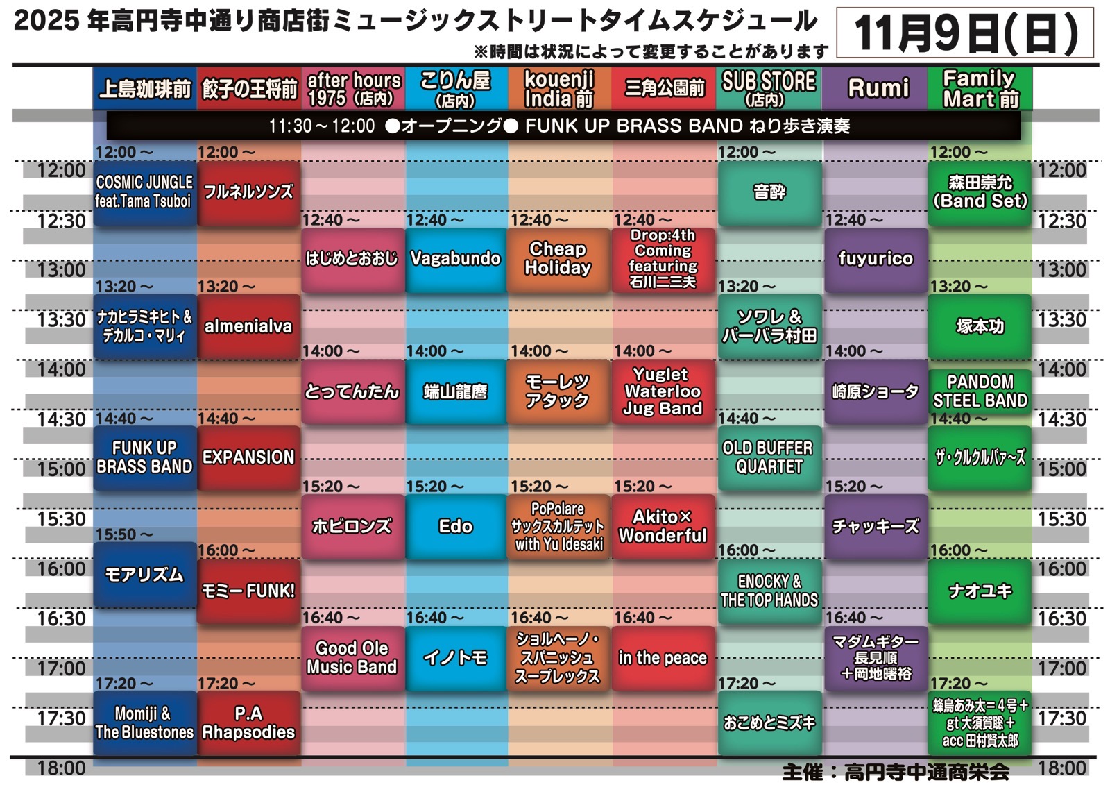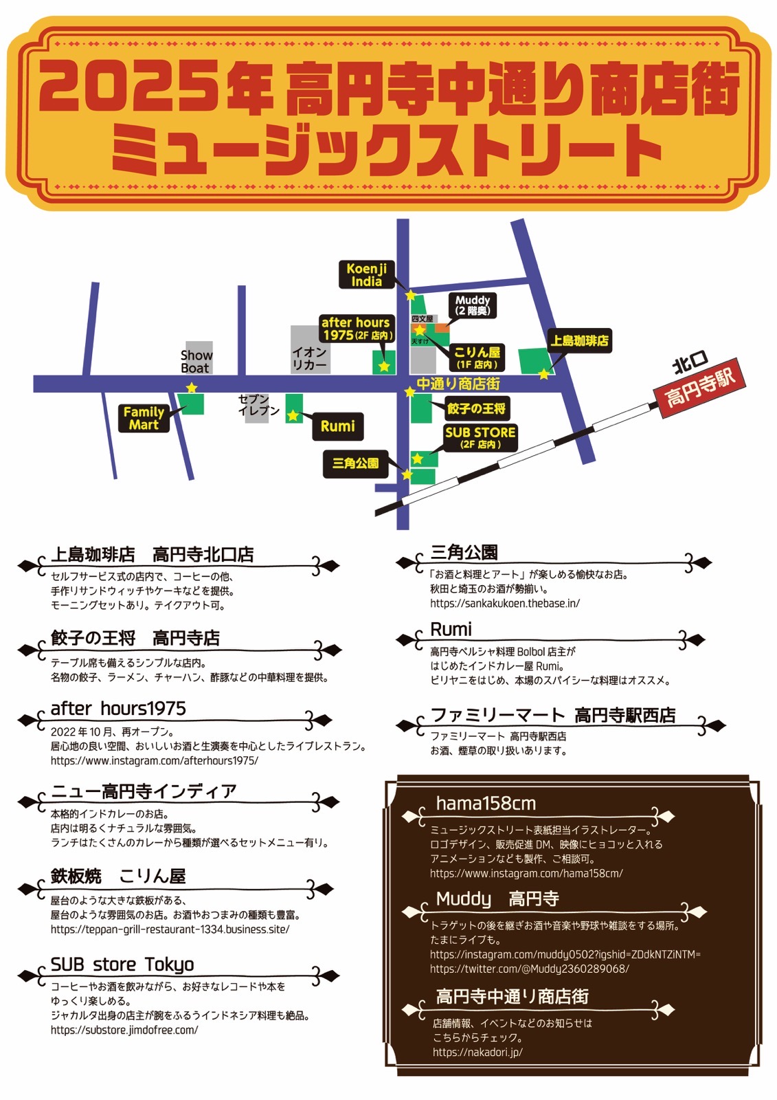 - 会場:上島珈琲店前、餃子の王将前、after hours 1975(2F店内)、Koenji India前、こりん屋(店内)、SUB STORE(2F店内)、三角公園前、Rumi、ファミリーマート前